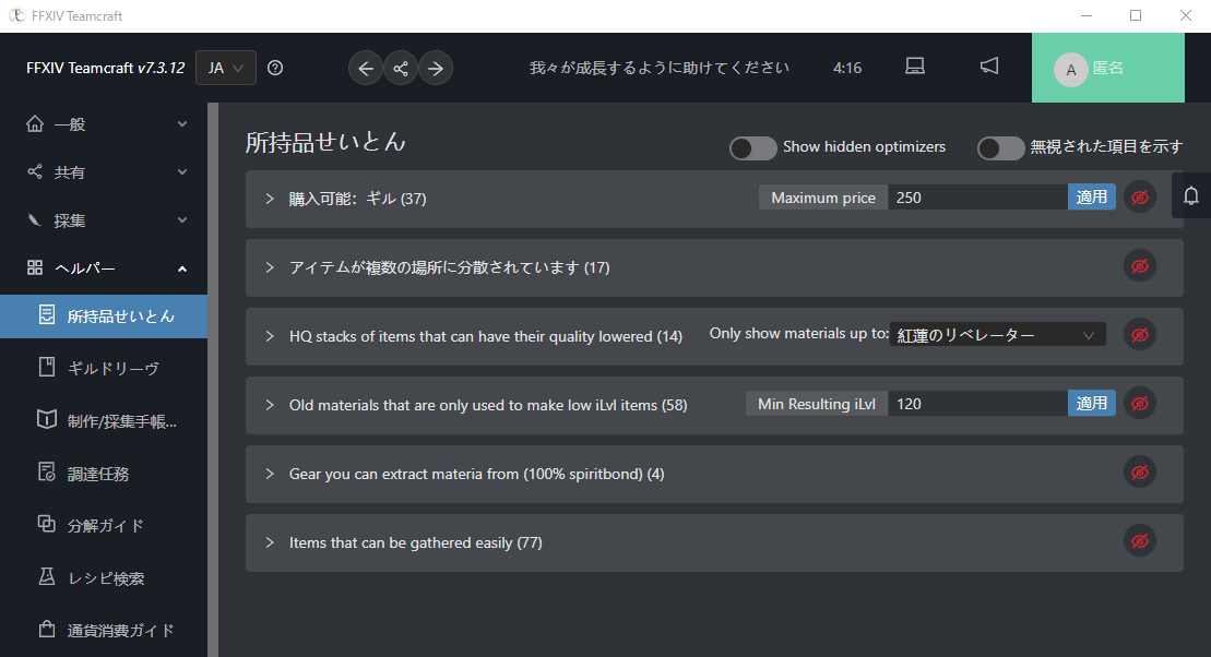 アプリ内の左ツールバーで ヘルパー→所持品せいとん を開きます。