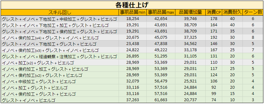 加工 を入れるだけでも、どのスキル回しで品質がいくつ上昇するか、