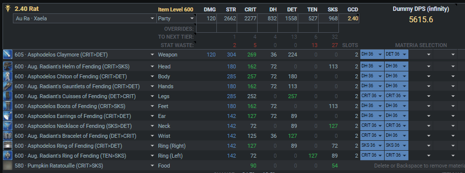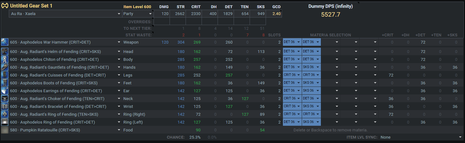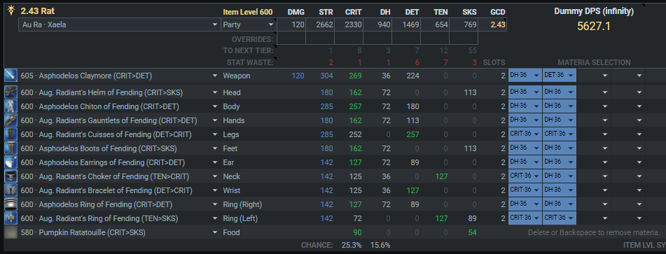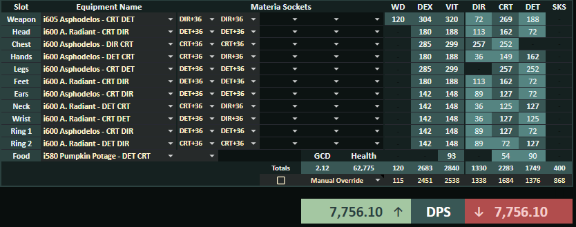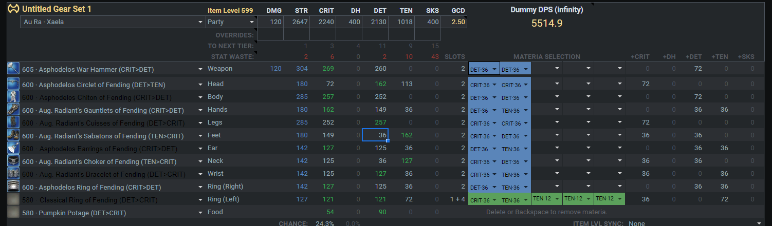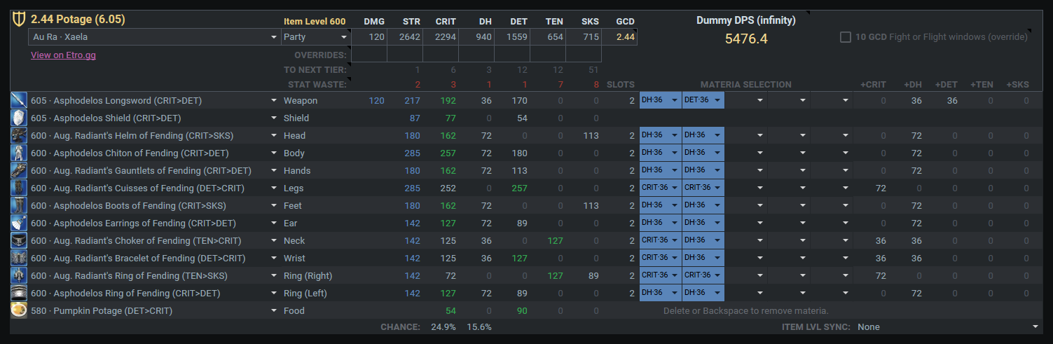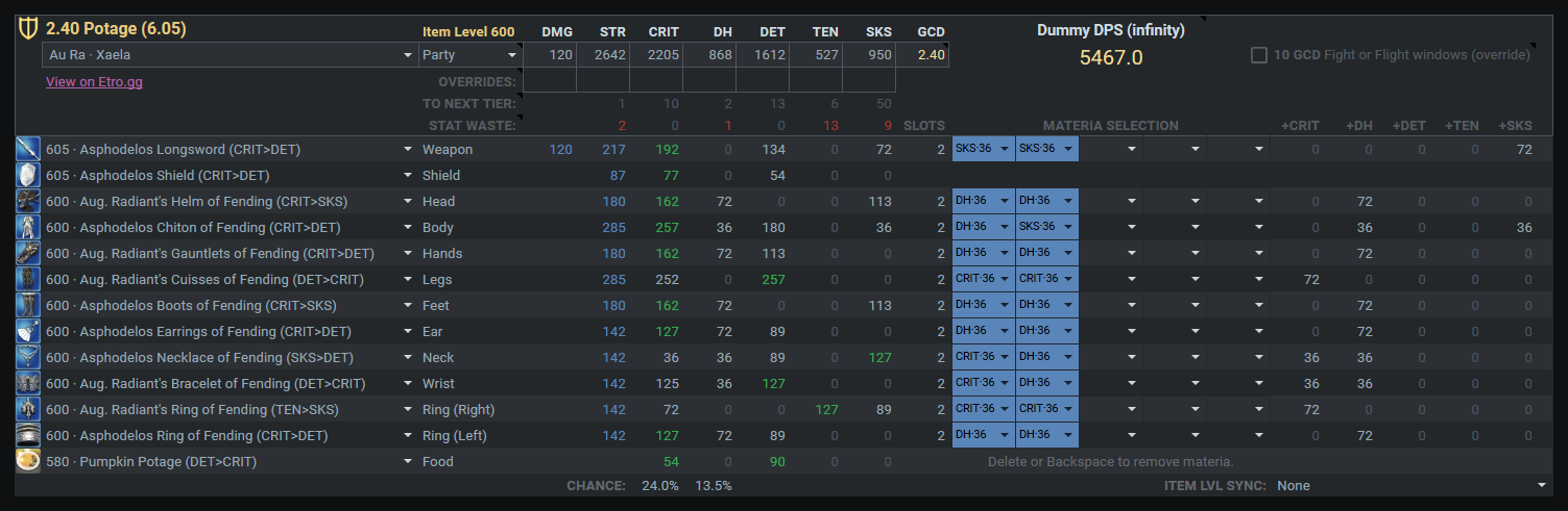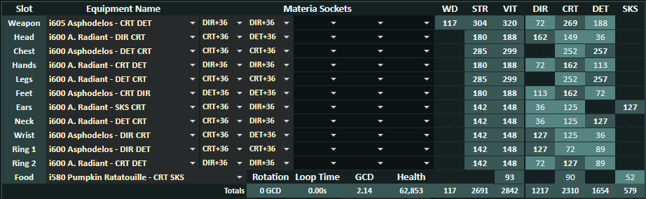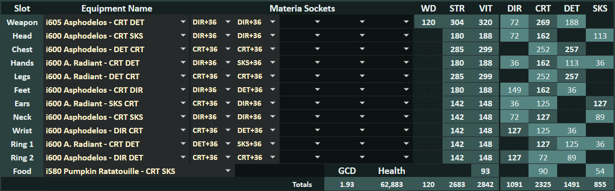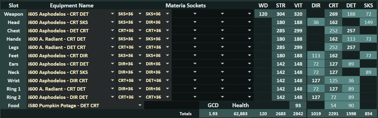 装備更新中のマテリア:GCD2.46-2.48確保(デミ中6GCD安定)>>>>Crit>意思≧DH>追加のSS