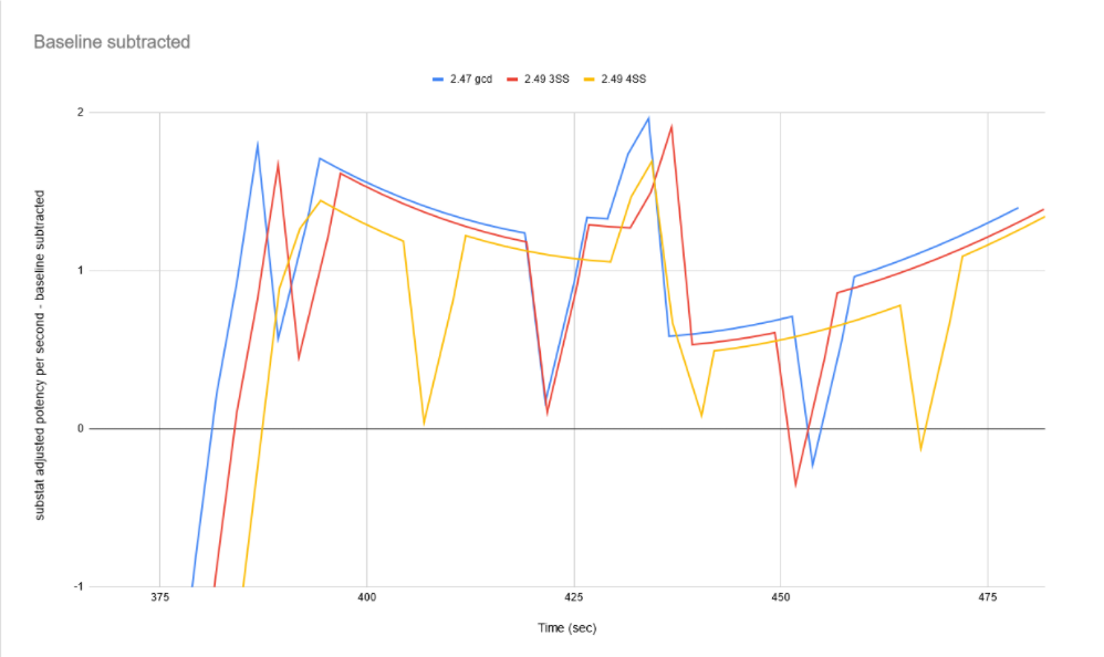 パッチ6.08のWS強化によりスタンダードステップの相対的な価値が下がり、GCD2.49/2.50で10WS/30秒ごとにきっちり入れるよりも、2.47で少しずらして11WSで回す方が強くなりました。
