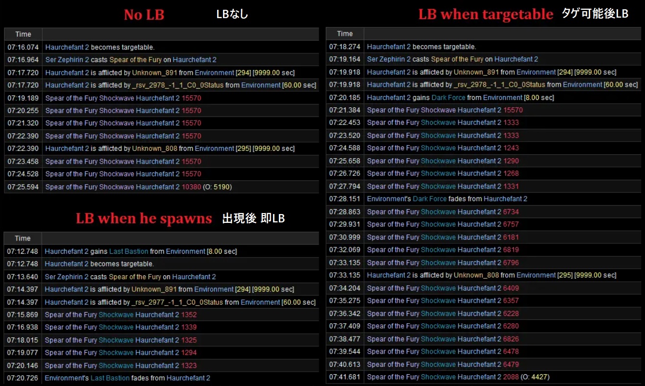 オルシュファンを救う方法を解明する過程で、戦闘ログは重要だった。フェーズ1とループ後のフェーズ1の違いはLB3があるかどうかだったので、これを利用するであろうことは明白だったが、具体的にどのように使うのかが問題だった。ほとんどのグループと同じように、まずはオルシュファンがターゲット可能になったら即タンクLB3を使うという方法を試した。これでオルシュファンが死ぬ速度は遅くなったものの、月末は変わらないように見えた。しかし、本来LBはPTメンバーに効果がかかるものであって、通常は近くにいるNPCは影響を受けないので、方向性としては正しいことがわかった。ログを見ると、タンクLB3は通常は使用したプレイヤーから近い順に波状に効果が入っていくのに対し、オルシュファンはタンク本人ではなく環境から即時に効果が付与されていたので、露骨なカスタム仕様であるように見えた。