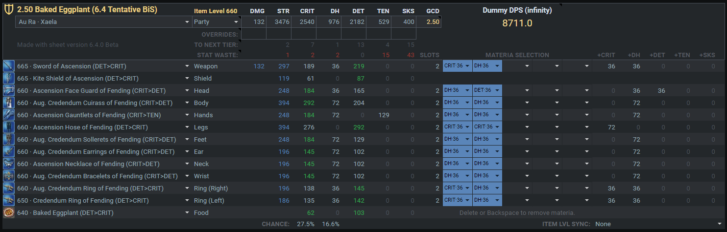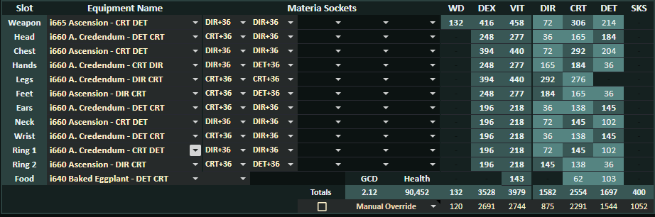 リーパーの最終装備(2.49)ともほぼ同じで、リーパーと着回す場合は胴のマテリアを意思→DHに変更します。(DPSロスは一桁)
